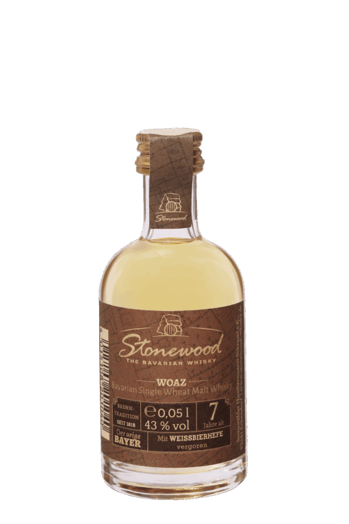 Stonewood Woaz – Single Wheat Malt Whisky mit 43 % vol. Aus Weizen- und Gerstenmalz. 7 Jahre in amerikanischer Weißeiche gelagert Typisch bayerische Idee – mit Weißbierhefe vergoren. „Woaz“ leitet sich vom bayerischen Wort für Weizen ab. Silbermedaille bei den German Whisky Awards 2025.